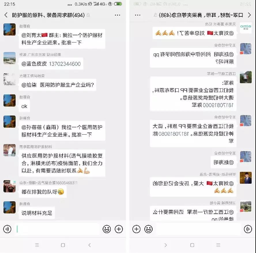 防护服、口罩材料装备微信群吸引了近千名分布于全国各地政府主管部门和相关企事业人士踊跃加入,联手打通产业链各相关渠道,为多地防护服、口罩生产基地急需生产材料与设备平价采购提供第一时间对接,使防护服、口罩产能得以恢复提升,为前线抗击新型冠状病毒肺炎,及时提供了非常重要的后方保障。
