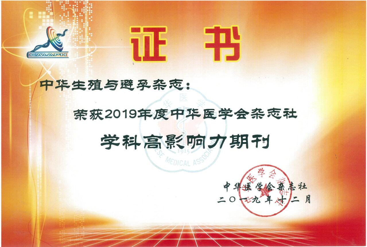 计生所《中华生殖与避孕杂志》荣获“2019年度中华医学会杂志社学科高影响力期刊”称号