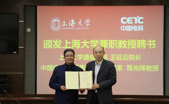 通信学院副院长张小贝介绍了首届“电科光电班”的建设情况。他表示,“电科光电班”依托于上海大学特种光纤与光接入网重点实验室,在双方战略合作框架协议与研究生培养协议的指导下,将采用“导师组联合培养制”,即校内导师、企业一级导师和二级导师协同育人。随后王廷云院长向集团公司首席科学家陈光辉教授颁发上海大学兼职教授聘书。