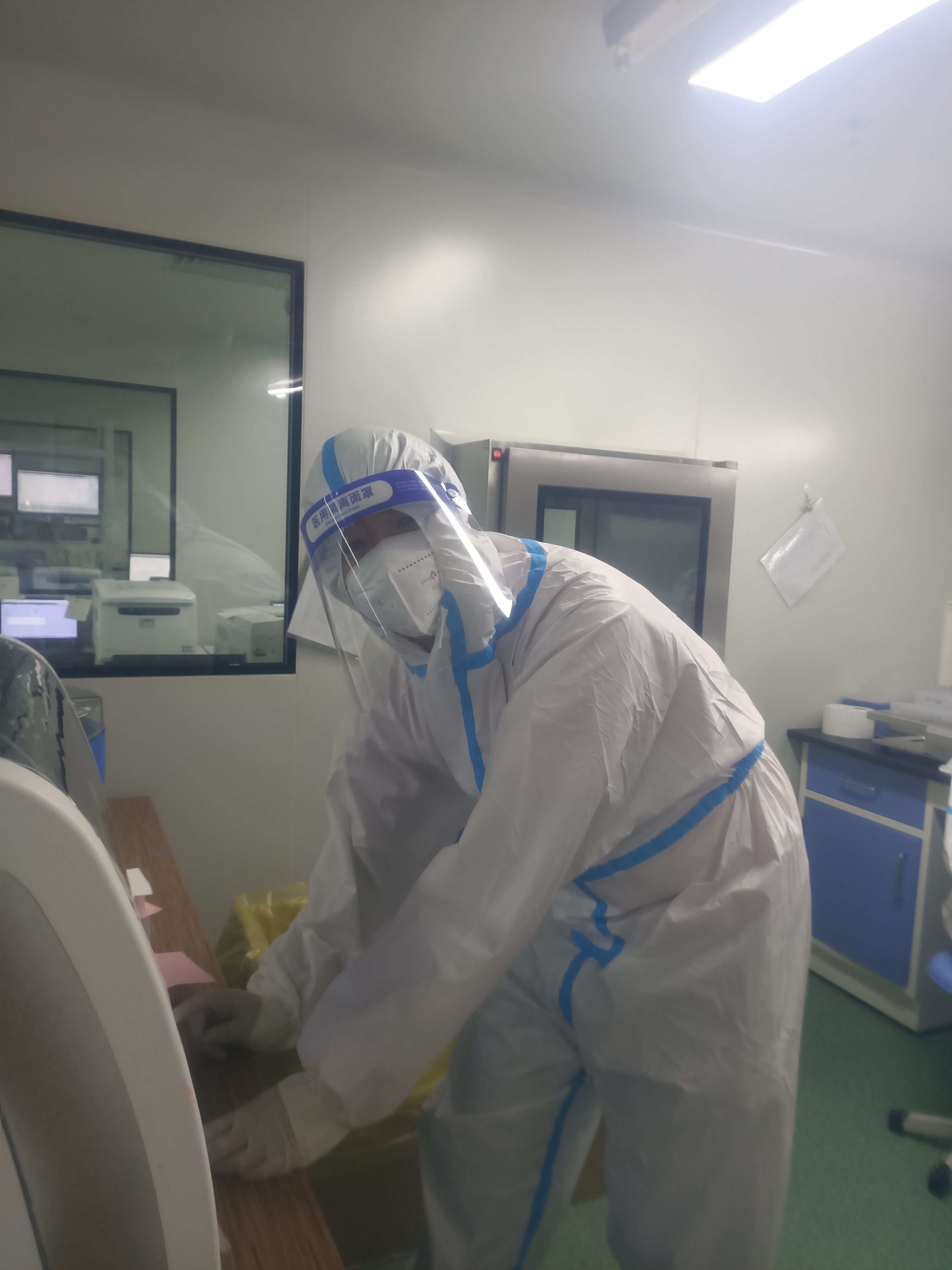 我们去的是宝山一家核酸检测机构,从事pcr检测,主要做的有核酸转移、核酸提取、核酸扩增。这次任务苦,时间紧。刚开始,我有点受不了穿着隔离服,在密闭的实验室工作,额头流汗不能用手擦,面屏经常被呼出的气弄得雾蒙蒙的。渐渐地,在同事无微不至的关怀下,我终于适应了。