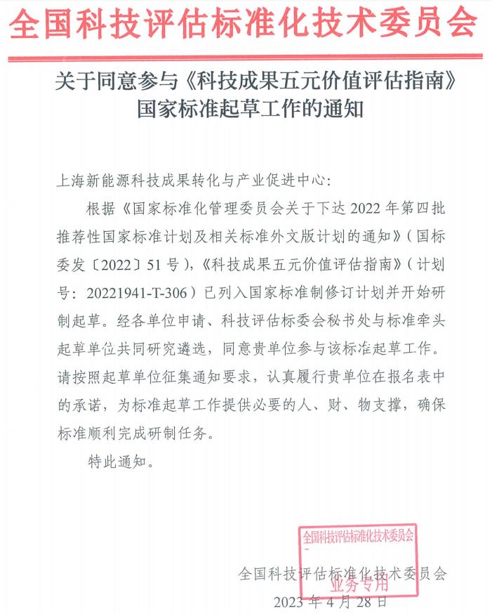 近日,新能源中心收到全国科技评估标准化技术委员会的通知,同意中心参与《科技成果五元价值评估指南》国家标准起草工作。这是中心自成立以来,首次参与国家标准起草工作,具有重要的里程碑意义。