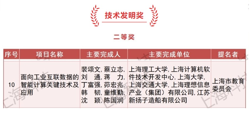 上海软件中心参与的“面向工业互联数据的智能计算关键技术及应用”获得技术发明二等奖。项目主要围绕解决智能制造场景中工业互联网大数据采集难、访问时延长、智能化应用程度低和缺乏统一的技术标准等关键问题,系统性解决了制造业高质量发展的技术瓶颈,该项目由上海理工大学牵头。