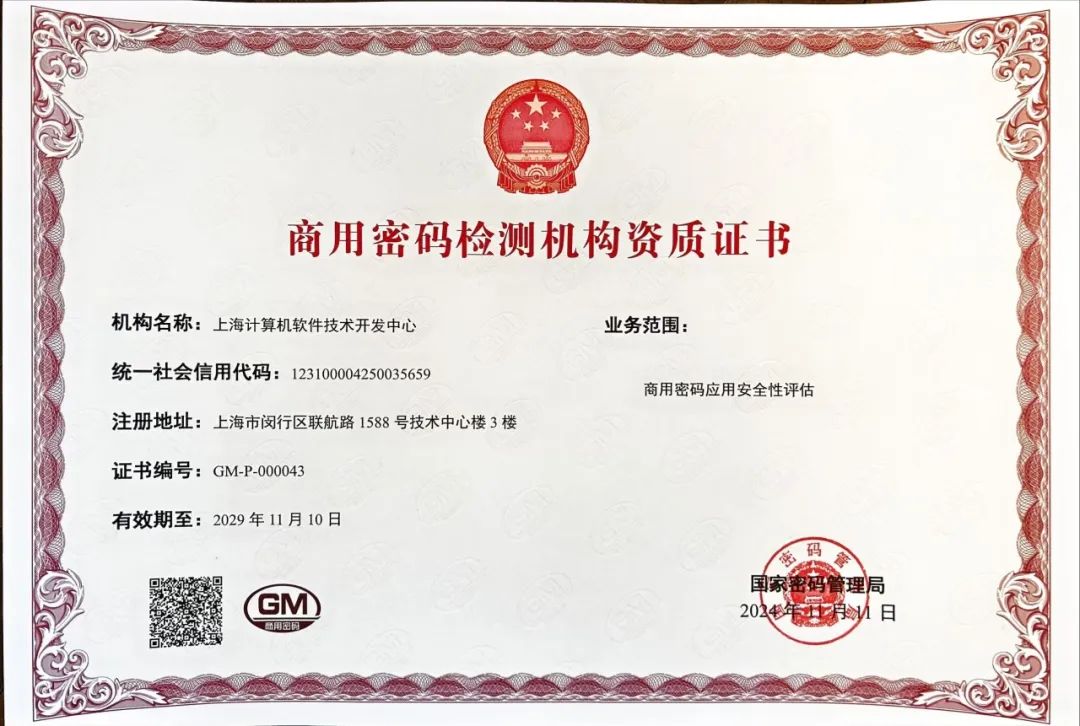 近日,上海计算机软件技术开发中心获得国家密码局颁发的全国首批《商用密码检测机构资质证书》。