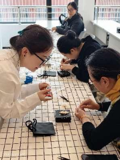 非遗手作环节,女职工们体验扬州绒花与螺钿镶嵌技艺。精心制作绒花发饰、螺钿发卡,将非遗文化融入生活,唤醒对传统文化的热爱。