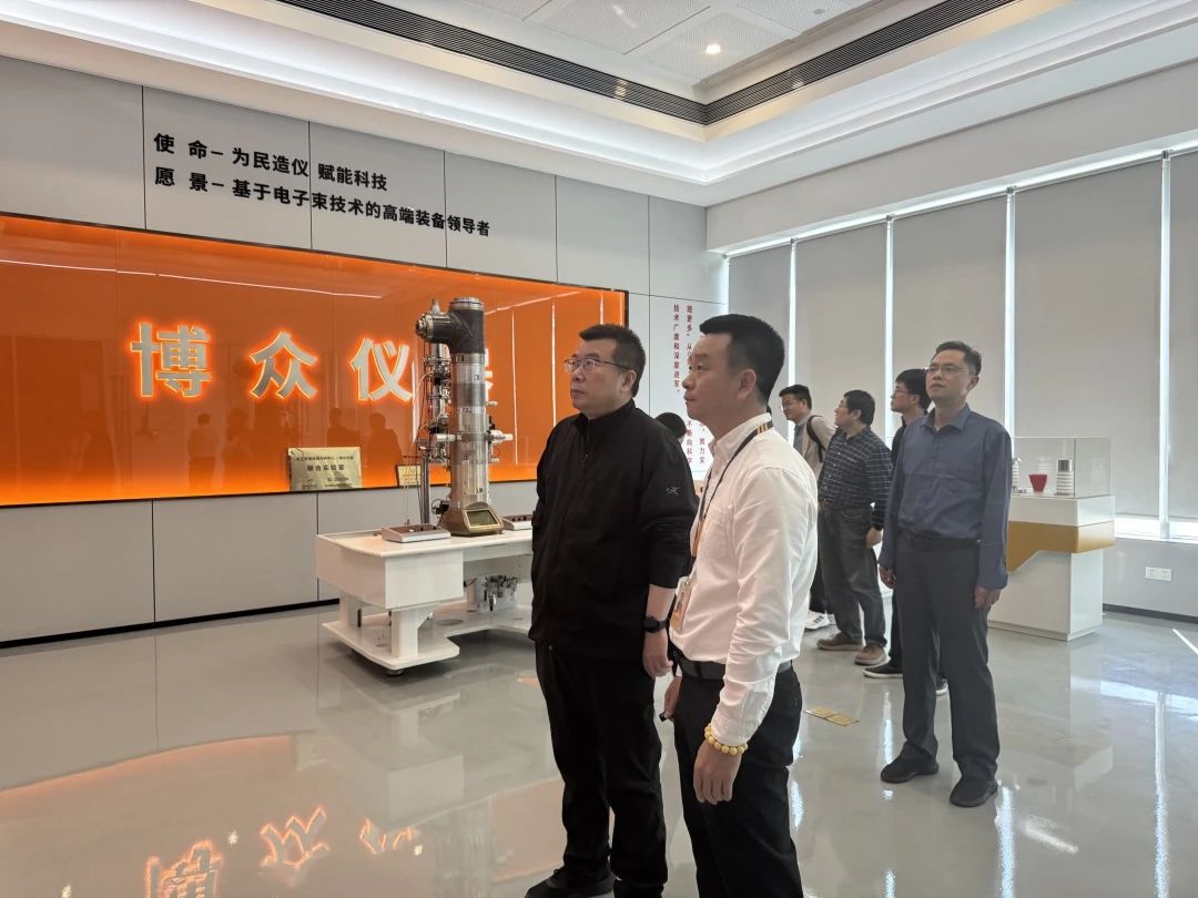 在博众仪器展厅,唐爱权总经理向孙真荣院长介绍了公司发展历程、人才队伍及核心产品。博众仪器通过技术创新与积累,已突破透射电镜各项核心技术,电镜整机已在材料科学、半导体等领域与客户开展了应用。在生产车间,实地观摩透射电镜装配线,重点交流高压电源稳定性评价机制、磁透镜设计及制造等工艺细节,孙真荣院长对博众仪器在透射电镜国产化方面取得的突破与成绩表示充分肯定。
