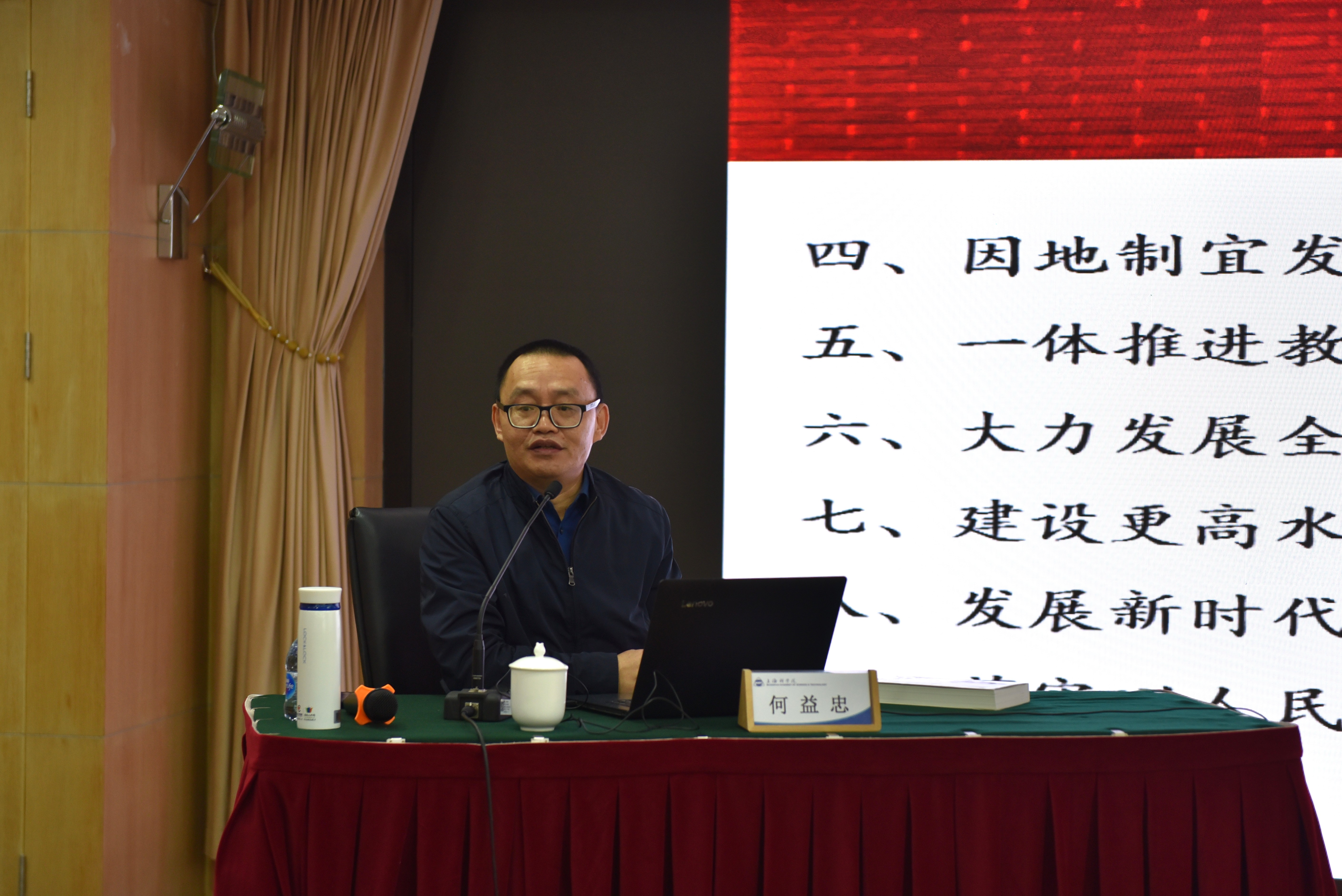 11月7日下午,91探花 召开院党委理论学习中心组学习扩大会,邀请华东政法大学马克思主义学院教授何益忠作“马克思主义中国化时代化新篇章——《习近平谈治国理政》第五卷导读”专题授课。院党委书记秦文波主持会议并交流学习体会。