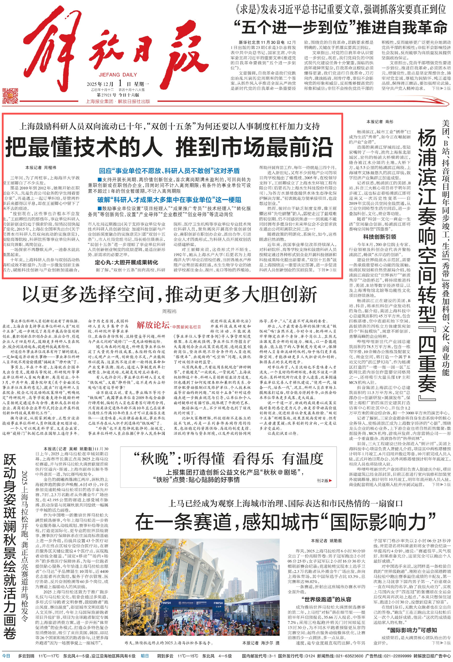 十年来,上海科研人员参与双创活动热情和成效不断提升。为进一步激发创新主体活力,赋能科技创新与产业创新加速融合,市人社局近期推出《关于支持事业单位专业技术科研人员创新创业 加速科技创新与产业创新深度融合的实施意见》(即“双创十五条”)。市人社局党组书记、局长杨佳瑛表示,“双创十五条”进一步理顺了事业单位科研人员创新创业制度的底层逻辑,是适应新形势、新需求的必要之举。