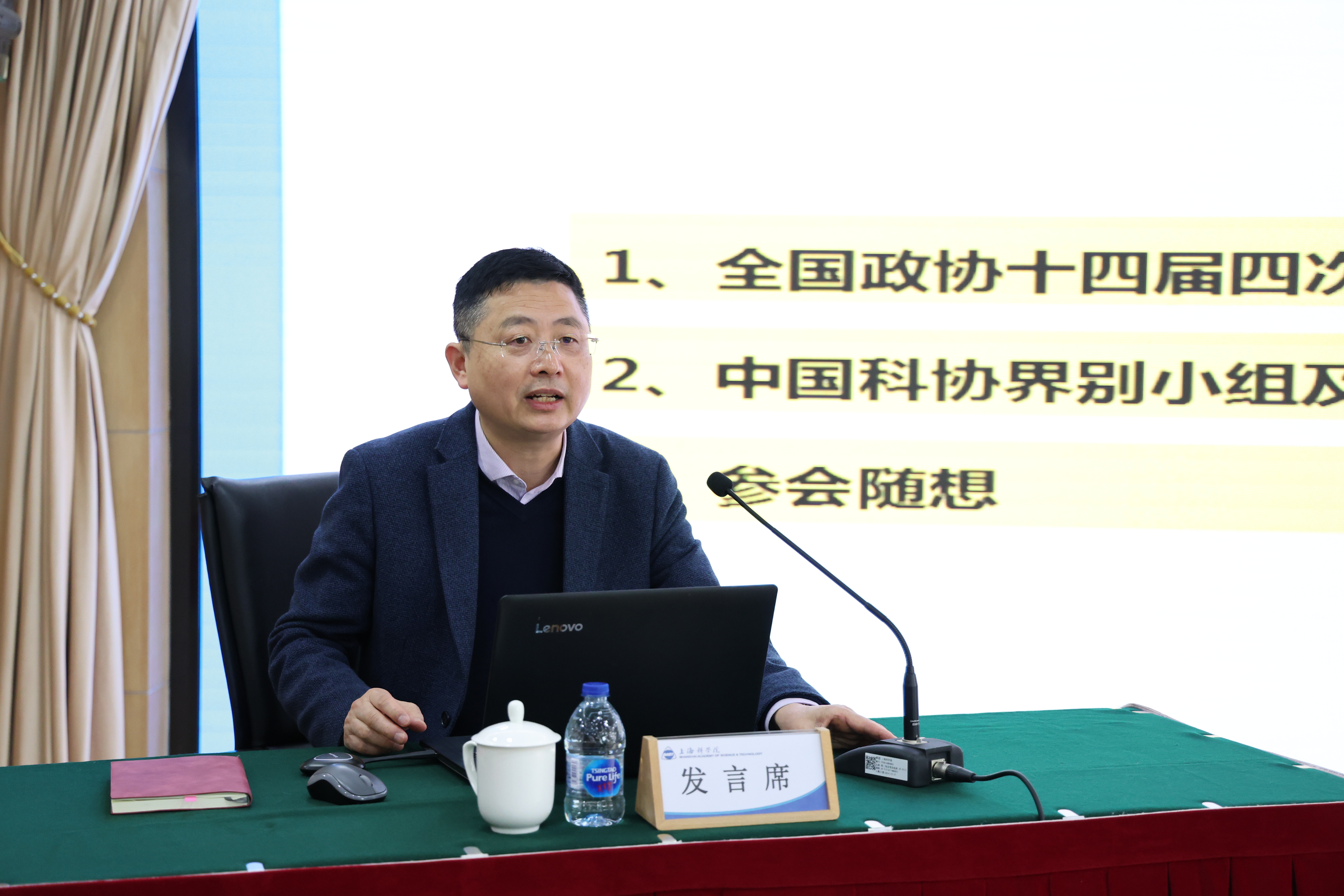3月19日,91探花 召开院党委理论学习中心组(扩大)学习会,传达学习全国两会精神,第十四届全国政协委员、民盟中央委员、民盟上海市委专职副主委曹阿民作专题报告。院党委副书记、院长孙真荣主持会议并讲话。